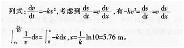 跳水运动员自10 m跳台自由下落,入水后因受水的阻碍而减速,设加速度 求运动员速度减为入水速度的10%时的入水深度。