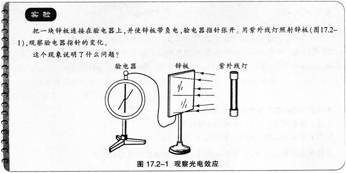 解析 师:l9世纪末的经典物理研究获得空前的成功,麦克斯韦的经典电磁理论确立,统一了电场与磁场理论,他所预言的电磁波被赫兹的实验证实,光的波动理论也得到空前的成功。但是赫兹在实验中发现了一种与光的波动理论不协调的现象,后来被人们称为光电效应现象,今天我们就追寻伟人的足迹去了解何谓光电效应现象。 教师操作实验并提问,学生注意观察与锌板相连的验电器的指针偏转情况。 教师打开紫外线灯,发出紫外线照射锌板。 生:指针张开了。 师:验电器的指针张开说明验电器和锌板怎么了呢? 生:带电了。 师:对,老师这里有一块丝绸和玻璃棒,谁能帮我检测下验电器和锌板带什么电? 学生纷纷举手,教师让学生甲上台进行操作。 学生甲用丝绸摩擦玻璃棒,将玻璃棒接触验电器小球。 生:指针张开角度更大了。 师:好,回去坐好吧。大家说明验电器和锌板带什么电? 生:正电。 师:你们是怎么判断的呢?原来电中性的锌板为什么会带正电呢? 生:因为丝绸摩擦过的玻璃棒带正电。角度变大说明验电器上的电荷变多,所以验电器带正电。锌板在伦琴射线照射下丢失电子,所以带正电。 师:看来大家都好好预习功课了,那这种在光的照射下物体发射电子的现象就叫作? 生:光电效应。 师:光电效应中被光照射的物体发射出来的电子叫什么? 生:光电子。 师:光电子的定向移动形成的电流叫? 生:光电流。 教师操作,屏幕显示光电效应、光电子、光电流的概念。 师:现在大家知道什么是光电效应了吧! 生:知道啦!