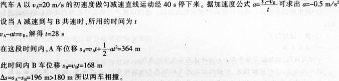 案例: 下面是某位同学对一道习题的解答。 题目:经检测汽车A的制动性能为:以标准速度20m/s在平直公路上行驶时,制动后40s停下来。现A在平直公路上...