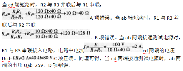 选项 A.当cd端短路时,ab之间的等效电阻是60 Q B.当ab端短路时,cd之间的等效电阻是40 Q C.当ab两端接通测试电源时,cd两端的电压为80 V D.当cd两端接通测试电源时,ab两端的电压为80 V