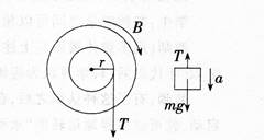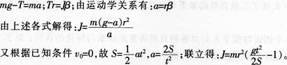 问题 质量为m的物体悬于一条轻绳的一端,绳另一端绕在一轮轴的轴上,如图所示。轴水平且垂直于轮轴面,其半径为r,整个装置架在光滑的固定轴承之上。当物体从静止释放后,在时间t内下降了一段距离S。试求整个轮轴的转动惯量。(用m、r、t和S表示)