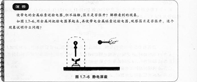 解析 (1)这个演示实验可用于说明静电屏蔽及其作用。 (2)师:同学们,大家都知道验电器是检验物体是否具有电荷的装置,大家思考当一个带电的导体小球,靠近验电器时.验电器的金属箔片会张开吗? 生:会。 师:为什么?我没有接触验电器,只是接近啊。 生:由于感应起电,使得验电器的上端聚集了一些与带电小球相反的电荷,而金属箔片就会带与带电小球相同的电。 师:很好,是不是和大家分析得一样呢?我们一块来看一下。(演示带电小球靠近验电器但不接触)。好!大家看到了什么? 生:验电器两金属箔片张开了角。 师:很好,大家分析得非常对,现在老师给验电器穿上一层衣服。这个“衣服”像笼子一样罩住了验电器,我用同一个小球靠近验电器,大家观察验电器和原来一样发生变化吗? 生:没有。 师:是不是验电器坏了?我们再仔细观察,去掉衣服后再将小球靠近验电器的金属,金属箔片的张角张开了!这说明了什么? 生:这层网状的“衣服”阻止了电荷的感应。 师:没错,这就是我们今天要给大家介绍的“静电屏蔽”现象。导体的外壳对它的内部起到保护作用,使它的内部不受外部电场的影响,这种现象称为静电屏蔽。大家想,这种静电屏蔽,有什么作用呢?(展示高压工作时工作人员穿的衣服和精细工作原件的静电屏蔽) 生:保护我们的工人和精细的电脑手机原件。
