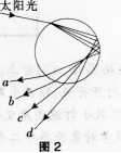 雨后.太阳光入射到大气中的水滴发生色散而形成彩虹。设水滴是球形的,图2中的圆代表水滴过球心的截面,入射光线在过此截面的平面内,a.b、c、d代表四条不同颜...