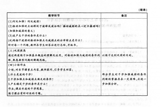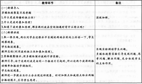 解析 (1)波的干涉条件:频率相同;振动方向相同;相位相同或相位差恒定。 (2)教学设计 一、教学目标 知识与技能: 了解波的叠加与干涉现象: 掌握发生稳定干涉现象的条件: 掌握波的干涉现象的应用: 过程与方法: 通过演示实验,学习探究科学的方法; 通过实验设计和动手实验,经历探究科学的过程。 情感态度与价值观: 通过对波的叠加与干涉现象的研究,培养学生运用科学理论观察分析周围事物的习惯,了解物理知识与现实生活的密切关系。 二、教学方法 实验法、多媒体教学法、习题练习法。 三、教学过程