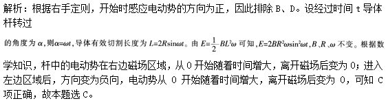 问题 如图6所示,纸平面内两个半径均为R的半圆相切于0点,半圆形区域内分别存在垂直纸面的匀强磁场,磁感应强度大小相等、方向相反,一长为2R的导体杆OA绕过D点且垂直于纸面的轴顺时针匀速旋转,t=0时,0A恰好位于两半圆的公切线上。若选取从D指向A的方向为电动势的正方向。下列描述导体杆中感应电动势占随时间t变化的图像正确的是()。