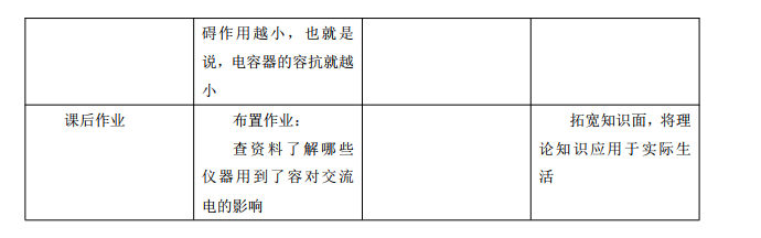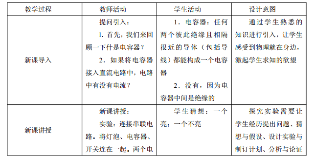 解析 (1)交变电流是指电流的方向随时间呈周期性变化的电流。交变电流在生活和生产中都有广泛 的应用,一般家庭电路和工业用电都是交流电。 (2)教学设计如下: 电容对交变电流的影响 一、教学目标 l.知识与技能 (1)了解交变电流能通过电器的原理,知道电容器对交变电流产生阻碍作用的原因。 (2)知道用容抗来表示电容对交变电流的阻碍作用的大小,知道容抗与哪些因素有关。 2.过程与方法 通过观察演示实验,具有根据实验现象和已学习知识去分析物理问题的意识。 3.情感态度与价值观 在用科学知识理解实验现象的过程中,体会科学地提出猜想的过程,逐步具有创新意识与实践能力。 二、教学重、难点 1.教学重点 交变电流能够通过电容器的原理;容抗的概念和影响因素。 2.教学难点 电容器“通交流”的实质。 三、教学过程