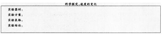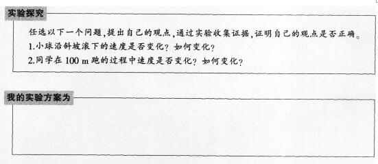 解析 (1)速度:速度等于运动物体在单位时间内通过的路程,表示物体运动的快慢,速度、路程与时间的关?(2)教学设计: 科学探究:速度的变化 一、教学目标 1.知识与技能:学生能够对实验测量的数据进行正确的分析与处理,通过采用将物体运动所经历时间或路程分解为若干段的方法测量不同阶段物体的运动速度。 2.过程与方法:学生通过对小球沿斜坡滚下的速度变化的探究,掌握科学探究的各个环节,积累相关的物理实验方法。 3.情感态度与价值观:学生能够用实验来验证自己的猜想与观点,形成科学严谨的思维方式以及实事求是的精神:在实验中,培养与他人合作交流的意识。 二、教学重难点 教学重点:能够准确地收集实验数据,对实验数据进行分析处理。 教学难点:能够制定探究计划、设计实验方案。 三、教学准备 停表、卷尺、小球、斜面、挡板等。 四、教学方法 启发法、讨论法、探究式教学法。 五、教学过程 (一)创设情景,引入课题 在导入环节,播放奥运会上博尔特百米赛跑的视频,让学生根据已有的知识来判断博尔特在百米赛跑的过程中。他的速度是如何变化的。具体可以如下展开: 师:大家知道2016年的奥运会在哪里举行吗?对,就是在巴西的里约热内卢!看来大家对奥运会都十分关注.那相信大家也知道目前的百米赛跑记录是谁保持的吧?对,就是博尔特!现在,我们来再次观看一下博尔特在奥运会比赛场上的英姿。不过,请大家在观看的过程中思考这样一个问题:在博尔特百米赛跑的过程中,他的速度是如何变化的? 教师播放视频。 同学甲:博尔特在跑步的过程中,前半部分速度越来越快,后来速度变慢。 同学乙:博尔特开始的时候,速度越来越大,但是后来速度保持不变。 教师:同学们通过观察都有了自己的观点,但是究竞谁的观点是正确的呢?他的速度究竟如何变化呢?我们该怎样证明自己的观点呢?通过这样的提问顺势引出课题:《科学探究:速度的变化》 设计意图:通过学生都了解的奥运名人并结合播放视频的形式,符合学生活泼好动的年龄特点,能够有效提高学生兴趣,让他们对日常生活中常见的现象进行思考,从而投入到课堂积极、愉悦的氛围中,有利于引出课题.进行新课的教授。 (二)合作探究,新课教授 (1)制定计划与设计实验 教师引导学生思考如何能够证明博尔特的跑步速度的变化情况。这时让学生分成小组进行讨论,当讨论结束后.让小组代表发言,教师予以恰当的评价。当大家充分交流讨论后,确定好实验的计划。具体可以如下进行: 教师:证明自己或别人的看法是否正确,需要收集有说服力的证据才行。大家想一想,怎样才能证明博尔特百米赛跑的速度变化呢?请大家前后四人为一小组,就这个问题进行探讨。 学生充分讨论,小组代表发言,说明各组的观点。教师对各组代表的发言,予以及时的肯定或者引导,给出恰当的评价。 教师归纳学生的讨论结果,明确或者引导学生发现方法:将物体运动路程或时间分为若干段,测量不同阶段的运动速度并进行比较。 当学生能够得出实验方法以后,请学生选择两个问题中的一个进行探究实验,由于学生的年龄特点,学生多会选择探究100m跑的过程中速度的变化。(若学生选择了另一问题,就在教室里进行分组探究) 确定了探究实验的选题以后,引导学生设计实验方案: ①器材的选择:停表、卷尺等。 ②实验方法:将路程分段,每10 m处站一同学计时。 ③实验数据记录表: 教师利用多媒体展示实验方法,接下来带领学生到操场上进行实验探究。 设计意图:在科学探究诸环节中,制定计划是比较难的一个环节,教师通过让学生进行小组讨论,并适时、适度、合理地引导或示范,能够让学生经过充分地思考,掌握一定的分析问题、解决问题的方法,有利于锻炼学生的物理思维。 (2)进行实验,收集证据 教师将学生分为3—4组,每组l2名左右的组员,小组内分工合作,1名运动员,10名计时员,1名记录员。教师讲明注意事项:①蹲踞式起跑;②分加速跑、中途跑、冲刺跑三个阶段;③终点不要急停;④发令枪冒烟各计时员同时计时.到达每一段处终止计时。 学生按分组进行实验探究.收集多组实验数据。 设计意图:为了确保实验结果的准确性,学生在实验的过程中要认真严谨。多组实验数据的收集,不仅能让所有的学生参与到实验的过程中来,同时多组实验数据的收集,更能保证结果的科学与准确。 (3)数据分析,论证猜想, 这一部分主要是教师和学生回到课堂中来,让学生分小组,对各组的实验数据进行分析处理,并且全班交流讨论。教师对学生得到的结果进行总结与分析,讲解平均速度的意义,以及说明什么是变速运动。 设计意图:为了让学生得到正确的实验结论,对实验数据的分析处理是十分重要的,在这个过程中,学生不仅能通过计算分析验证自己的观点是否正确,并且能够体会到物理科学的严谨性,培养他们分析问题、解决问题的能力。 (4)评估、交流与合作 在这一环节中,教师让学生在此对本节课的探究过程、数据收集及分析论证等环节进行评估、交流与合作。教师进行适时的点评与总结。 设计意图:实验结束后的交流与总结,有利于加强学生对科学探究的理解,并且充分地体现了科学的严谨性。提高了学生总结问题的能力。 (三)巩固练习,知识应用 教师通过多媒体展示相关练习题: 某班同学在用皮尺和秒表测平均速度时,四位记时员记录