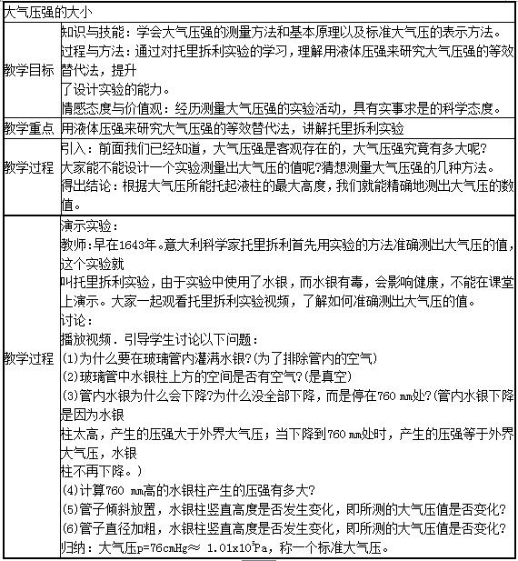 解析 (1)大气对浸在里面的一切物体均具有压强,这种压强叫作大气压强,简称大气压或气压。 (2)因为该实验中用到了水银(汞),汞是有毒的,为了安全起见,所以用录像。 (3)教学设计: