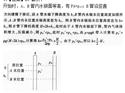 问题 如图2所示,粗细均匀的玻璃管A和B由一橡皮管连接,一定质量的空气被水银柱封闭在A管内,初始时两管水银面等高,B管上方与大气相通。若固定A管,将B管沿竖直方向缓慢下移一小段距离H,A,A管内的水银面相应变化h,则以下判断正确的是()。