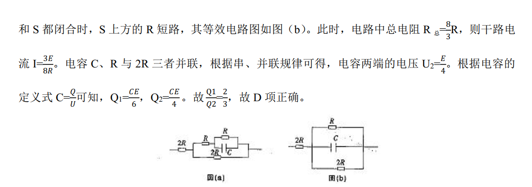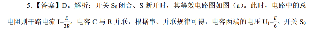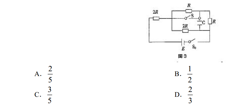 问题 阻值分别为 R 和 2R 的电阻、 电容 C 以及电源 E 连接成如图 3 所示电路, 电源内阻可忽略。当开关 S0 闭合后, 开关 S 断开且电流稳定时, C 所带的电荷量为 Q1; 接着闭合开关 S, 电流再次稳定后, C 所带的电荷量为 Q2。 则 Q1 与 Q2 的比值为( )。