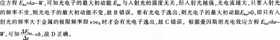 选项 A.逸出功与v有关 B.Ekm与入射光强度成正比 C.v<v0时.会逸出光电子 D.图中直线的斜率与普朗克常量有关