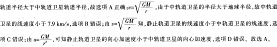 选项 A.静止轨道卫星的运行周期大于中轨道卫星的运行周期 B.中轨道卫星的线速度大于7.9 km/s C.静止轨道卫星的线速度大于中轨道卫星的线速度 D.静止轨道卫星的向心加速度大于中轨道卫星的向心加速度
