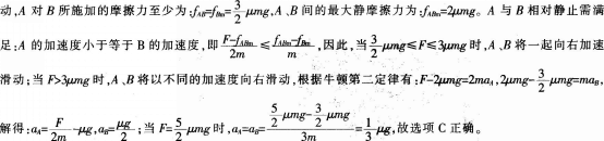 问题 如图所示,A、B两物块的质量分别为2m和m,静止叠放在水平地面上。 A、B间的动摩擦因数为μ,B与地面间的动摩擦因数为μ/2。最大静摩擦力等于滑动摩擦力,重力加速度为g0现对A施加一水平拉力F,则①当F<2μmg时,A、B都相对地面静止。②当F=5/2μmg时,A的加速度为1/3μg。③当F>3μmg 时,A相对B滑动。④无论F为何值,B的加速度不会超过1/2μg中,正确的选项为()。