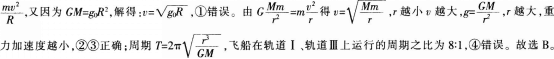 选项 A①飞船在轨道Ⅲ的运行速率大于(g0R)1/2 B②飞船在轨道l上运行速率小于在轨道Ⅱ上B处的速率 C③飞船在轨道l上的重力加速度小于在轨道Ⅱ上B处重力加速度 D④飞船在轨道l、轨道Ⅲ上运行的周期之比有T1:TⅢ=4:1