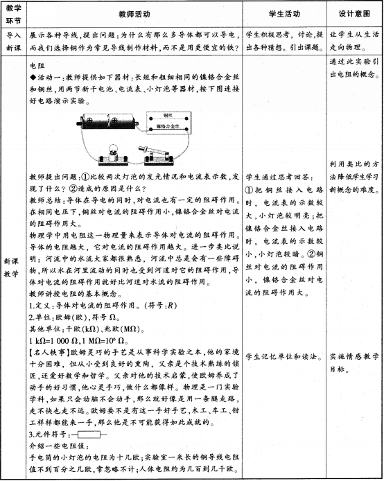 解析 (1)在物理学中,用电阻来表示导体对电流阻碍作用的大小。 (2)教学设计如下: 一、教学目标1.知识与技能:知道影响电阻大小的因素有材料、长度、横截面积和温度。 2.过程与方法: ①通过探究影响电阻大小的因素,进一步体会研究多个因素问题的方法。 ②学会用学过的知识和技能解决新问题的方法。 3.情感态度与价值观: ①在实验探究中,学习科学家研究问题的方法,培养严谨的习惯和实事求是的态度。 ②通过了解物理学知识对人类生活和社会发展的影响,培养正确的科学价值观。 二、教学重难点 本节内容主要由两部分组成:认识电阻的概念和知道电阻的影响因素。电阻是电学的一个很重要的物理量,它是初中电学学习的核心之一。教学重点是电阻概念的建立,教学难点是通过实验说明决定电阻大小的因素有哪些。 三、教学过程 (续表) (续表)