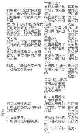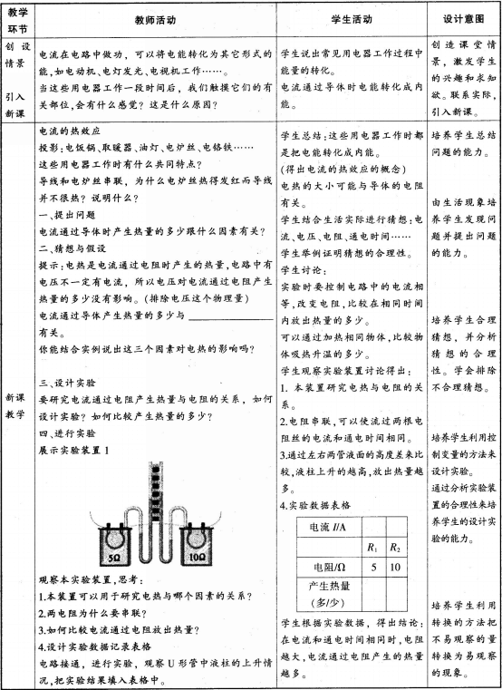 解析 (1)电流通过导体产生的热量跟电流的二次方成正比,跟导体的电阻成正比,跟通电时间成正比。这个规律叫做焦耳定律。 (2)教学设计如下: 一、教学目标: 1.知识与技能 ①能通过实例,认识电流的热效应。 ②能在实验的基础上得出电热的大小与电流、电阻和通电时间有关,知道焦耳定律。 ③会用焦耳定律进行计算,会利用焦耳定律解释生活中电热利用与防治。 2.过程与方法 体验科学探究过程。了解控制变量的物理方法,提高实验探究能力和思维能力。3.情感态度与价值观 会解释生活中一些电热现象,通过学习电热的利用与防止,学会辩证地看待问题。 二、教学重难点: 重点:通过实验研究电热与电流、电阻和通电时间的关系,并确定研究方法及实验操作中各个环节应注意的问题。 难点:对焦耳定律的理解及焦耳定律在实际生活中的应用。 三、教学过程: (续表) (续表) (续表)