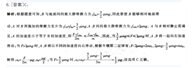 问题 如图所示,A、B两物块的质量分别为2m和m,静止叠放在水平地面上。 A、B间的动摩擦因数为μ,B与地面间的动摩擦因数为μ/2。最大静摩擦力等于滑动摩擦力,重力加速度为g0现对A施加一水平拉力F,则①当F<2μmg时,A、B都相对地面静止。②当F=5/2μmg时,A的加速度为1/3μg。③当F>3μmg 时,A相对B滑动。④无论F为何值,B的加速度不会超过1/2μg中,正确的选项为()。