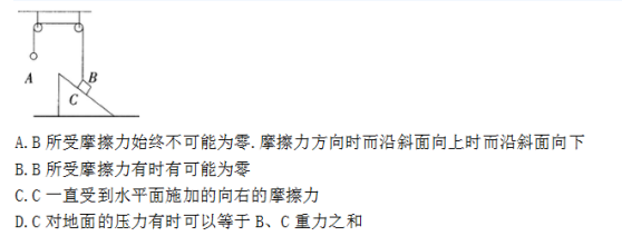 问题 如图所示,物体C放在水平面上,物体B放在C上,小球A和B之间通过跨过定滑轮的细线相连。若8上的线竖直、两滑轮间的线水平,且不计滑轮的质量、滑轮轴上的摩擦、滑轮与线间的摩擦。把A拉到某位置(低于滑轮)由静止释放使A在竖直平面内摆动,在A摆动的过程中B、C始终不动。下列说法中正确的是( )。