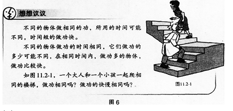 问题 材料:如图6是某初中物理教科书“功率”一节中的内容。 任务: (1)简述什么是功率。 (2)基于该图片内容,设计一个包含师生交流的教学方案。