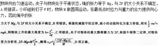 选项 A.物块向右匀速运动时.绳中的张力等于2F B.小环碰到钉子P时.绳中的张力大于2F C.物块上升的最大高度为 D.速度V不能超过