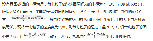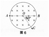 问题 如图6所示,圆形区域内有垂直于纸面向里的匀强磁场.一个带电粒子以速度v从A点沿直径AOB方向射入磁场,经过Δt时间从C点射出磁场,OC与OB成60°角。现将带电粒子的速度变为v/3,仍从A点沿原方向射入磁场,不计重力,则粒子在磁场中的运动时间变为()。
