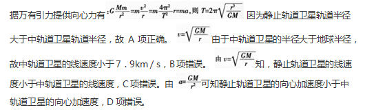 选项 A.静止轨道卫星的运行周期大于中轨道卫星的运行周期 B.中轨道卫星的线速度大于7.9km/s C.静止轨道卫星的线速度大于中轨道卫星的线速度 D.静止轨道卫星的向心加速度大于中轨道卫星的向心加速度