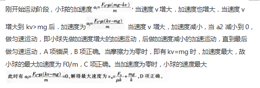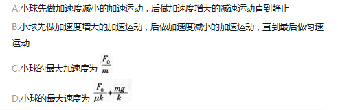 问题 如图7所示,穿在足够长的水平直杆上质量为m的小球开始时静止。先对小球沿杆方向施加恒力F0,垂直于杆方向施加竖直向上的力F,且F的大小始终与小球的速度成正比,即F=kv(图中未标出)。已知小球与杆间的动摩擦因数为μ,且Fo>μmg。下列说法错误的是()。