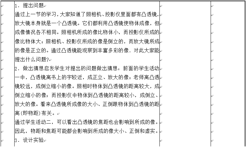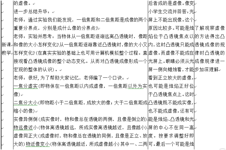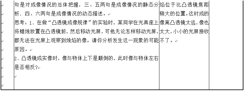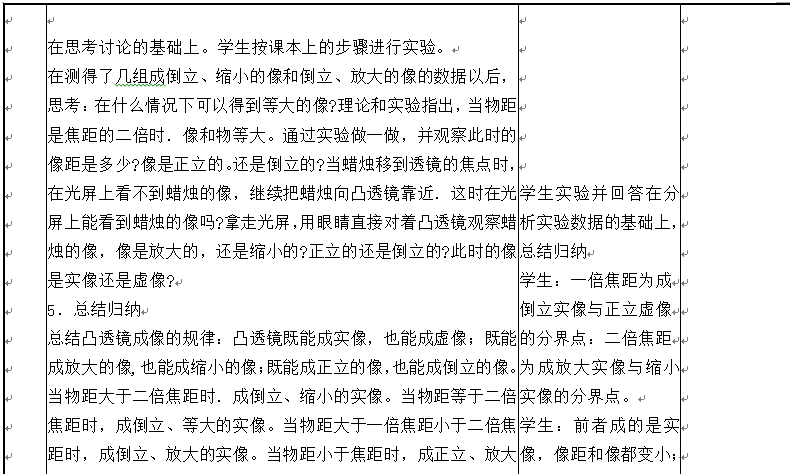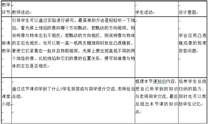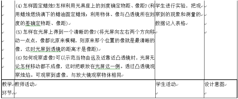 解析 (1)凸透镜成像的规律: 当物距大于二倍焦距时,成倒立、缩小的实像。 当物距等于二倍焦距时,成倒立、等大的实像。 当物距大于一倍焦距小于二倍焦距时,成倒立、放大的实像。 当物距小于一倍焦距时,成正立、放大的虚像。 (2)教学设计如下: 一、教学目标 1.知识与技能 ①理解凸透镜的成像规律。 ②知道凸透镜成放大、缩小实像和虚像的条件。 2.过程与方法 ①能在探究活动中,初步获得提出问题的能力,体验科学探究的全过程和方法。 ⑦通过对凸透镜成像现象的观察分析,总结出凸透镜成像规律,并用列表的方法归纳出凸透镜成放大或缩 小、正立或倒立、实像或虚像的条件,培养从物理现象中归纳科学规律的方法。 3.情感态度与价值观 ①通过研究凸透镜成像的实验以及对其成像规律的分析,有意识地渗透辩证唯物主义观点。 ②通过探究活动,提高学习兴趣,学生增强了对科学的求知欲,乐于探索自然现象和日常生活中的物理学 道理.勇于探究日常生活中的物理学规律。 二、教学重难点 重点:探究凸透镜成像规律。 难点:科学探究中实验数据的处理和分析。 三、教学过程