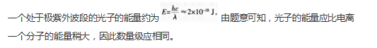 问题 2017年年初,我国研制的“大连光源”——极紫外自由电子激光装置,发出了波长在100 nm(1 nm=10-9 m)附近连续可调的世界上首个最强的极紫外激光脉冲。大连光源因其光子的能量大、密度高,可在能源利用、光刻技术、雾霾治理等领域的研究中发挥重要作用。一个处于极紫外波段的光子所具有的能量可以电离一个分子,但又不会把分子打碎。据此判断,能够电离一个分子的能量约为(取普朗克常量h=6.6×10-34J?s,真空光速为c=3×108m/s) ()。