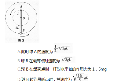 问题 如图3所示,轻杆长为3L,在杆的A、B两端分别固定质量均为m的球A和球B,杆上距球A为L处的O点装在光滑的水平转动轴上,外界给予系统一定的能量后,杆和球在竖直面内转动,在转动的过程中,忽略空气的阻力。若球B运动到最高点时,球B对杆恰好无作用力,则下列结论错误的是().