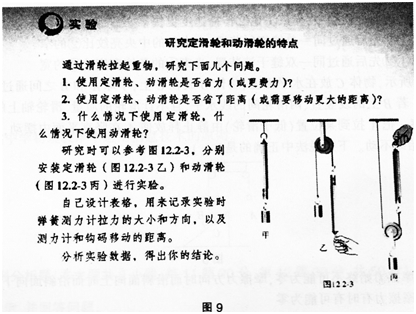 解析 (1)使用定滑轮不省力,但可以改变力的方向;使用动滑轮可以省力,但不改变力的方向,且费距离。 (2)针对图12.2-3,请学生观察,看两种方法提升钩码时有哪些不同?在比较轴是否移动的基础上总结出定滑轮和动滑轮的定义。 思考:我们知道力有三要素,就是力的大小、方向和作用点。定滑轮能改变力的方向。是否能改变力的大小?动滑轮不能改变用力的方向,能否改变力的大小?下面通过实验进行探究。 请同学们结合实验,思考以下问题: ①使用定滑轮的好处是什么? ②使用定滑轮可以省力吗? ③使用定滑轮可以省动力作用点移动的距离吗? 总结:使用定滑轮不省力,不省距离;但可以改变力的方向。 请同学们结合实验,思考以下问题: ①使用动滑轮能改变动力的方向吗? ②使用动滑轮可以省力吗? ③使用动滑轮可以省动力作用点移动的距离吗? 总结:使用动滑轮可以省力,但费距离,且不改变力的方向。