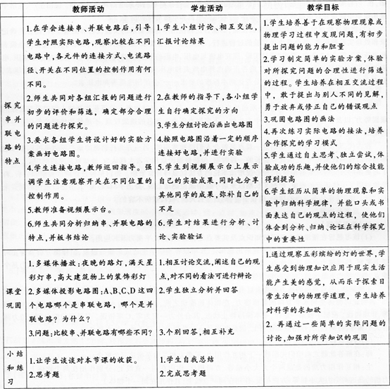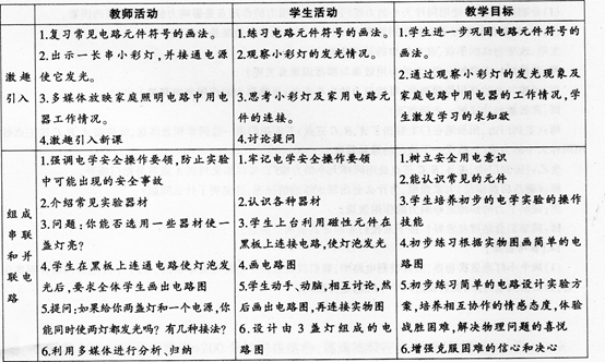 解析 (1)两个小灯泡依次相连,然后接到电路中,我们就说这两个小灯泡是串联的。两个小灯泡的两端分别连在一起,然后接到电路中,我们说这两个小灯泡是并联的。 (2)教学设计如下: 一、教学目标 1.知识与技能 (1)认识常见的电路符号,会画简单的电路图。 (2)能连接简单的串、并联电路。 (3)培养电学实验操作技能。 (4)初步了解开关在电路中不同位置时的控制作用。 2.过程与方法 (1)学习用实验的方法探究串、并联电路的区别,通过实验具备观察能力和科学探究能力。 (2)经历从简单的物理现象和实验中归纳科学规律、并能口头或书面表达自己的观点的过程,体会到分析、归纳、论证在科学探究中的重要性。 3.情感、态度与价值观 (1)通过实验培养相互合作的精神和对科学的求知欲,体验战胜困难,解决物理问题的喜悦。 (2)通过举例生活、生产中的简单串、并联电路的实际应用,认识科学技术对于人类生产、生活的影响。 (3)得到安全用电的初步教育。 二、教学资源 多媒体课件,视频展示台,初中物理电学磁性元件一套,1.5v干电池60节,2.5V的小灯泡(灯座)60个,开关60个,导线若干。 三、教学设计思路 本节课是完整探究环节的一节课,它的最主要的作用是理顺探究环节:提出问题一讨论设计实验一进行实验一分析论证一评估。使学生经历这一节课后,清晰地知道探究的各个环节,以提高学生的探究能力,解决更多的实际问题。 四、教学过程