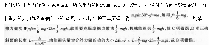问题 如图2所示,质量为m的物体(可视为质点)以某一速度从A点冲上倾角为30o的固定斜面,其运动的加速度为2/3g,此物体在斜面上上升的最大高度为h,则在这个过程中物体()。