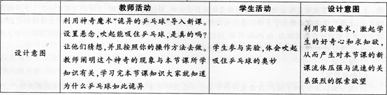 阅读材料,根据要求完成教学设计任务。 材料一《义务教育物理课程标准(2011年版)》关于“流体压强与流速关系”的要求是:“了解流体压强与流速的关系及在生...