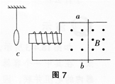 如图7所示,金属导轨上的导体棒ab在匀强磁场中沿导轨做下列哪种运动时,铜质线圈c中将有感应电流产生且被螺线管吸引。() ①向右做匀速运动②向...
