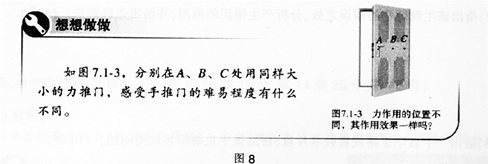 阅读材料,根据要求完成教学设计。 材料:图8为初中物理某教科书“力”一节中的想想做做。 任务: (1)说明分别在A、B、C处用同样大小的...
