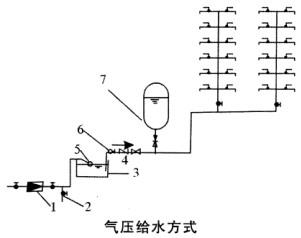 1.水表;2.泄水管;3.贮水池;4.止回阀;5.浮球阀;6.水泵;7.气压罐
