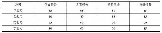 解析 由题意,总得分=信誉得分*20%+方案得分*30%+报价得分*40%+答辩得分*10%。则:甲公司的总得分=85*20%+95*30%+80*40%+85*10%=86;乙公司的总得分=90*20%+85*30%+85*40%+85*10%=86;丙公司的总得分=95*20%+90*30%+90*40%+90*10%=91;丁公司的总得分=80*20%+90*30%+90*40%+85*10%=87.5。丙公司的总得分最高,因此应选择而公司。