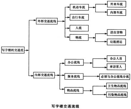 解析 本题考核的知识点为写字楼内部交通流线的内容。内部交通流线包括物品流线、服务流线和办公线,如下图所示。