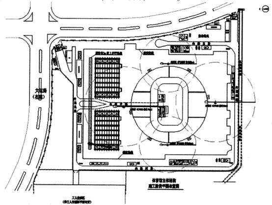 某省大型体育场占地面积为304350m2,占奥林匹克体育中心占地面积975873m2的30. 58%。其中:体育场建筑基底面积为38630m2,田径场面积为30300m2(包括比赛场、训练场),道路、广场面积为171845m2,绿地面积为30375m2。