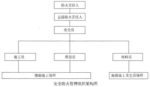 成立以工程防火责任人、直接防火责任人和其他成员(包括安全员、施工员、质量员、材料员、后勤、保卫、仓管、机管、电工)组成的安全防火管理领导小组。详见下图。