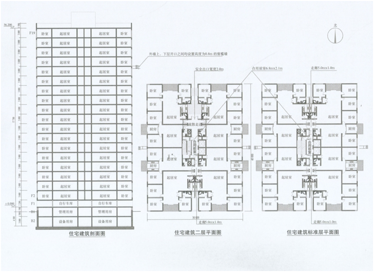 解析 1.该建筑的建筑高度应为54m,地上部分建筑层数为18层,地下部分建筑层数为2层;建筑分类为二类高层住宅建筑(关于建筑高度、建筑层数和民用建筑的建筑分类已在案例1中描述)。 2.该建筑内应设置室内消火栓系统、火灾自动报警系统、机械防烟设施、机械排烟设施和疏散照明,住宅户内宜配置轻便消防水龙。 3.情景描述中与现行有关国家工程建设消防技术标准不符之处: (1)组成剪刀楼梯问的两部防烟楼梯间与消防电梯的合用前室,其短边为2.1m。 (2)合用前室在首层通过1个净宽为2m的疏散门直通室外。 (3)二层至十九层疏散走道的净宽为1m。 (4)二层至十九层进入合用前室的两个安全出口之间未设环形或半环形疏散走道连通。 (5)该建筑外墙上、下层开口之间实体墙的设置高度均为0.8m。 (6)二层至十九层住宅外墙上相邻户开口之间的墙体宽度均为0.8m。 整改措施: (1)组成剪刀楼梯问的两部防烟楼梯间与消防电梯的合用前室,其短边不应小于2.4m。 (2)合用前室在首层应通过1个净宽不小于2.2m的疏散门直通室外。 (3)二层至十九层疏散走道的净宽不应小于1.1 m。 (4)二层至十九层进入合用前室的两个安全出口之间应设置环形或半环形疏散走道连通。 (5)该建筑外墙上、下层开口之间实体墙的设置高度不应低于1.2m,或设置挑出宽度不小于1.0m、长度不小于开口宽度的防火挑檐;实体墙和防火挑檐的耐火极限和燃烧性能,均不应低于相应耐火等级建筑外墙的要求。 (6)二层至十九层住宅外墙上相邻户开口之问的墙体宽度不应小于1m;小于1.0m时,应在开口之间设置突出外墙不小于0.6m的隔板;实体墙和隔板的耐火极限和燃烧性能,均不应低于相应耐火等级建筑外墙的要求。 知识点热度:★★★★考试难度:中 关键词:住宅建筑有关安全疏散设施的防火设置要求、建筑外墙的层间防火分隔等