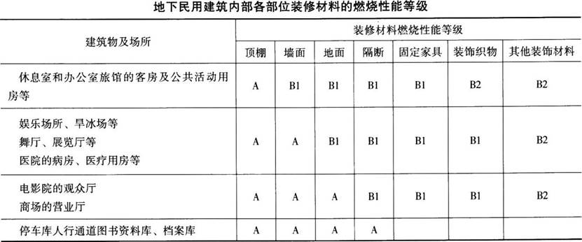 解析 本题考查单、多层民用建筑装修防火。地下民用建筑内部各部位的装修材料的燃烧性能等级除应符合下表的规定外,还特别规定地下民用建筑的疏散走道和安全出口的门厅,其顶棚、墙面和地面的装修应采用A级装修材料。而对于那些人员密度大、人员流动性大的地下商场、地下展览厅的售货柜台、固定货架、展览台等也规定采用A级装修材料。