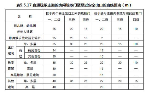 解析 《建筑设计防火规范》GB50016-2014 5.5.17 公共建筑的安全疏散距离应符合下列规定:1 直通疏散走道的房间疏散门至最近安全出口的直线距离不应大于表5.5.17 的规定:表5.5.17 直通疏散走道的房间疏散门至最近安全出口的直线距离(m) 注:1 建筑内开向敞开式外廊的房间疏散门至最近安全出口的直线距离可按本表的规定增加5m。2 直通疏散走道的房间疏散门至最近敞开楼梯间的直线距离,当