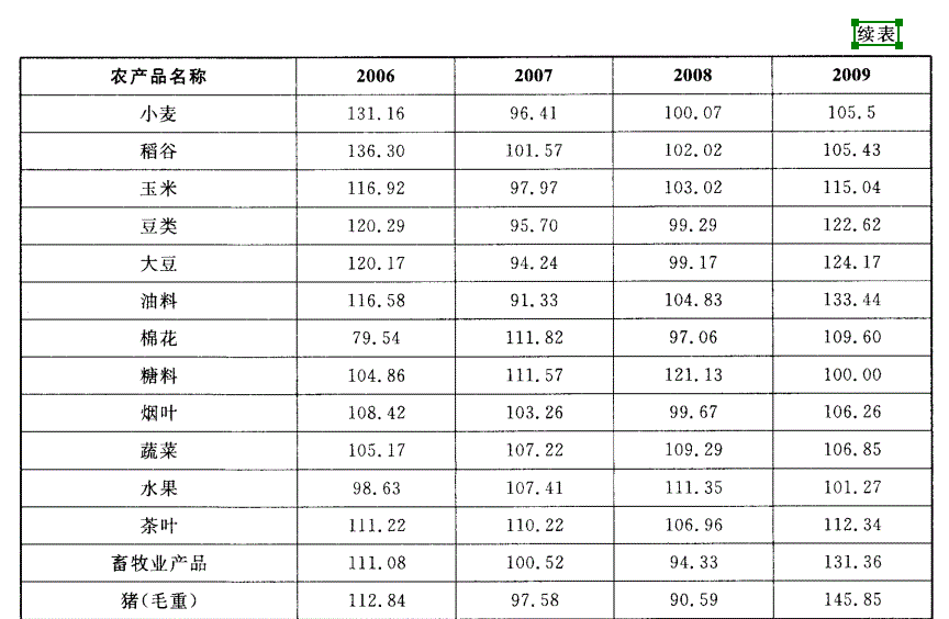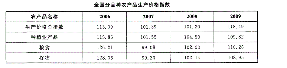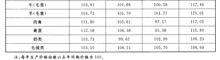 解析 2007年生产价格总指数为101. 39,超过这个指数的农产品有:稻谷、棉花、糖料、烟叶、蔬菜、水果、茶叶、牛(毛重)、羊(毛重)、肉禽、禽蛋、毛绒类,一共12种,故本题 正确答案为D。