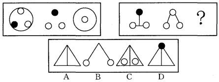 解析 第一组图形中,前两个图形的外部轮廓叠加为第三个图形的外部轮廓,内部三个小圆去异存同,且到第三个图形中位置变到中间,第二组图形也应符合此规律,本题选C。