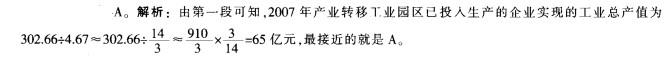 问题 2004年,广东省委省政府首次提出珠三角与山区及东西两翼共建产业转移工业园。截至2009年4月,广东全省已认定产业转移园32个,14个欠发达地市已至少有一个产业转移园。 至2008年底,广东省29个产业转移园已投入开发资金111.38亿元,入园项目(含意向)973 个,总投资1156亿元,已动工建设项目611个,投资额542.2亿元。园区已投入生产的企业2008年实现工业总产值302.66亿元,实现利税27.72亿元,分别是2007年的4.67倍和5.33 倍。园区用工约16.42万人,其中吸纳本地劳动力9.96万人,占60.7%。 从皮鞋和陶瓷这两个劳动密集型、附加值相对较低的行业看,近年广东的产业布局得到优化。从皮鞋行业看,珠三角地区规模以上皮鞋企业的工业产值占全省的比重从2003年的98.2%下降到2008年的86.2%,下降了12个百分点;其中广州下降幅度很大,从31下降到14.4%。而珠三角地区外围的清远皮鞋生产大幅度增加,从0.9%上升到11.7%;梅州、潮州、揭阳则从无到有,三市2008年的皮鞋产值比重为0.7%。从陶瓷行业看,珠三角地区规模以上陶瓷企业的工业产值占全省的比重从2003年的66.4%下降到2008年的51.4%,下降了15个百分点;其中广州陶瓷产值所占比重从7.2%下降至2.3%,佛山陶瓷从48.8%下降至35.1%,下降13.7个百分点,下降幅度最大。而珠三角地区外围的清远陶瓷生产增加较快,比重从1.1%上升到5.7%;潮州陶瓷从28.0%上升到43.7%,增加幅度最大。 2007年广东省产业转移工业园实现工业总产值为()亿元。 A.64.8 B.62.5 C.60.7 D.57.6