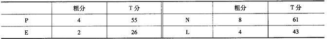 解析 . 内外向E为26分,为内向型,神经质N为61分,为不稳定型,内向不稳定的气质类型是抑郁质。T分在43.3 ~56.7分之间为中间型,各量表的T分在38.5 ~43.3分或56.7~61.5分之间为倾向型(该被试N为61),而T分在38.5分以下或61.5分以上为典型型。