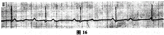 问题 62岁男性,10年前健康体检时"窦性心动过缓",近2个月来,黑蒙3次。查体:脉搏38次/分,节律规整,BP120/70mmHg,心电图如图16。 ? 心电图诊断