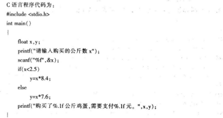 某超市的鸡蛋促销方案规定:“购买鸡蛋2.5公斤以下每公斤8.4元,购买鸡蛋2.5公斤以上(含2.5公斤)每公斤7.6元”。请用你熟悉的计算机语言,设计一个...